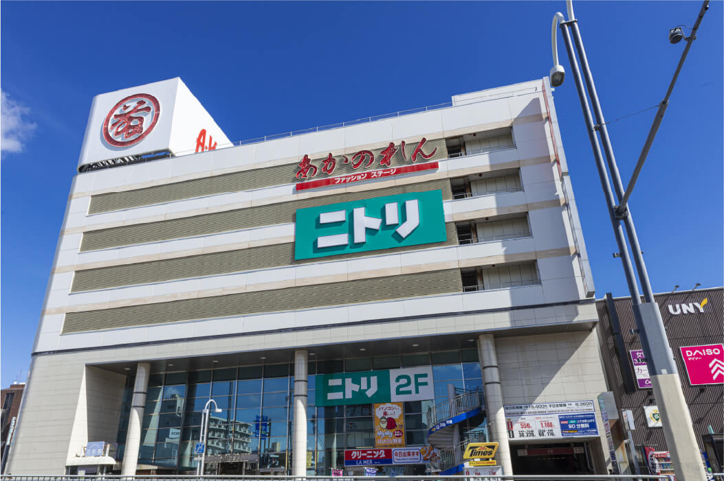 ファッションメーカーのあかのれん、インテリアショップのニトリを併設。普段使いのファッションやインテリアのアイテムが豊富で、お値打ちな価格で揃っています。