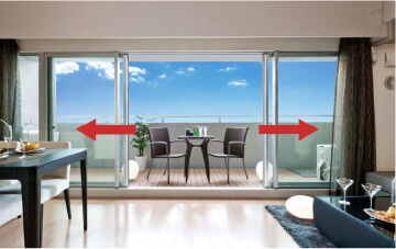 リビング・ダイニングのサッシは中央から開閉し、開放感を高めるセンターオープンサッシを採用。