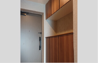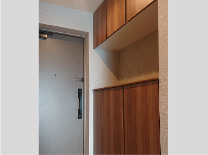 真ん中にカウンターを設け、上下に収納棚を設けたセパレート下足入れを採用しました。