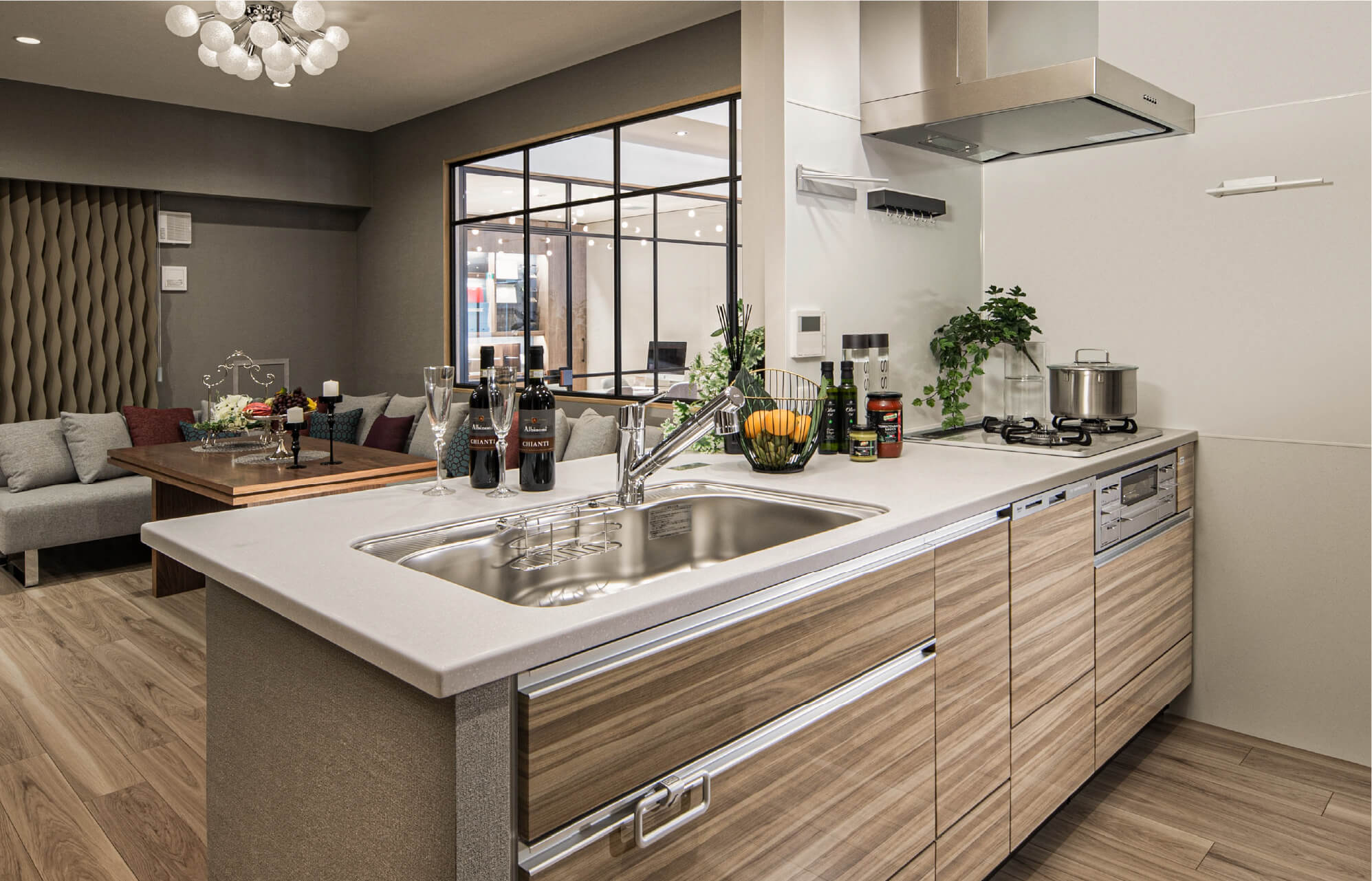 キッチン天板は、カウンターと一体型にすることで広さを確保。さらに、リビング・ダイニングとの一体感が生まれるフルオープンキッチンを採用。