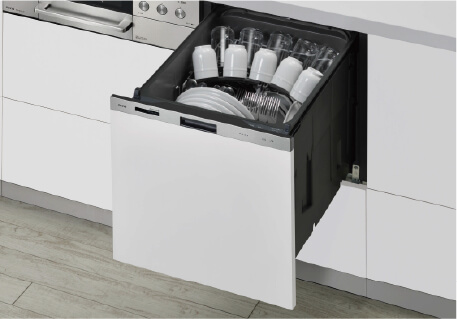 キッチンキャビネット内に収まり、見た目もスッキリ。食器洗いの負担も軽減され、環境にやさしい重曹洗浄機能付きで節水や経済性も優れています。