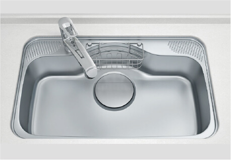 水はね音を抑制する制振材を仕込んだ静音設計のシンク。大きなフライパンも洗いやすい大型サイズです。