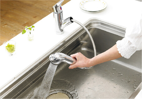 シンクの隅まで掃除できるシャワーヘッドが引き出せるタイプを採用。吐水はストレートとシャワーの2種類を利用できます。