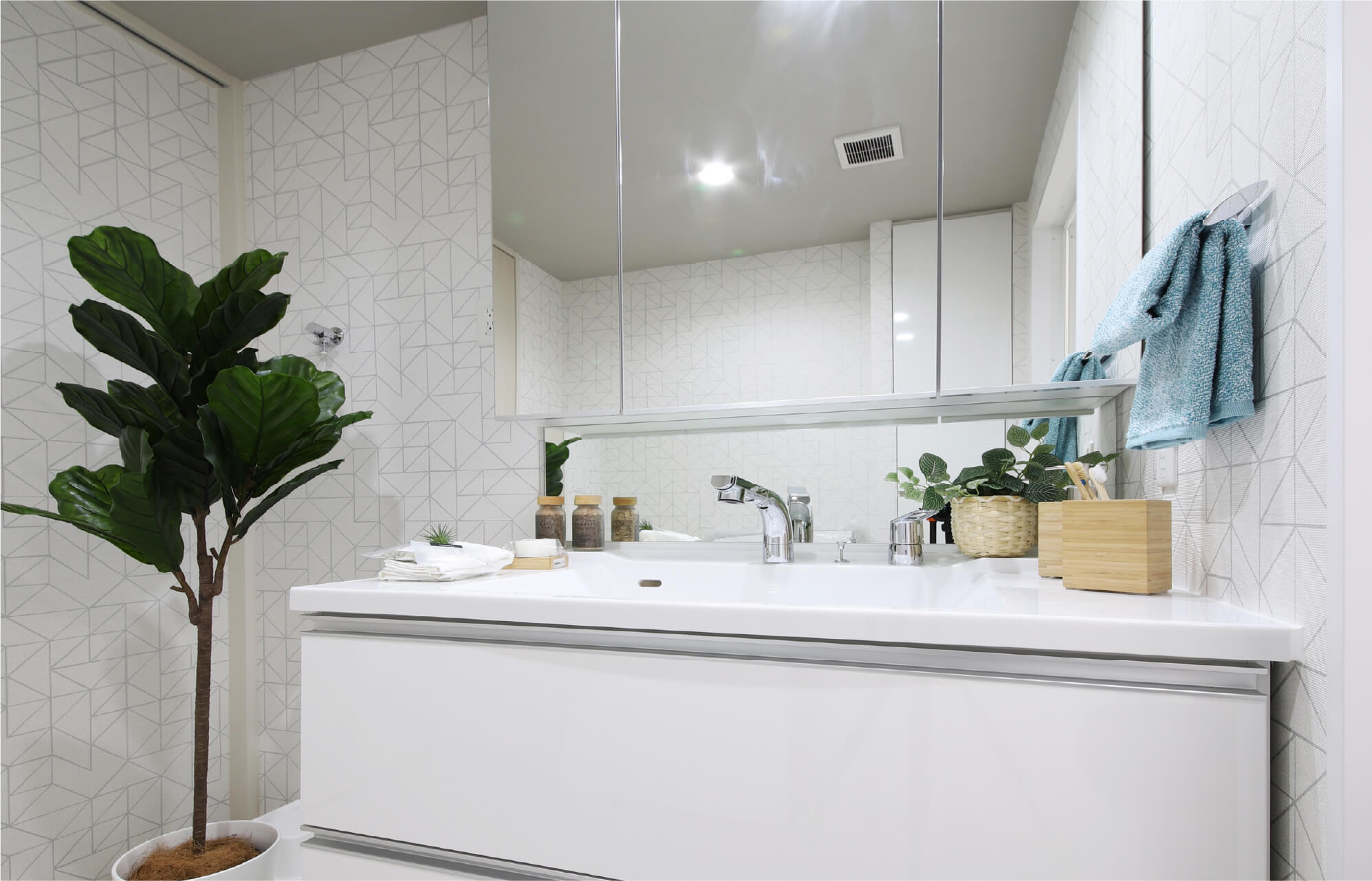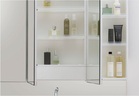 鏡裏に収納スペースを設けた大型三面鏡を採用。洗面用具や化粧品、小物が収納でき便利です。