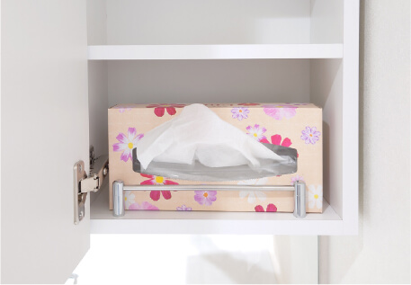 三面鏡裏の収納には、ティッシュBOXを置くのに便利なホルダーも備えました。