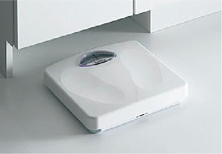 洗面化粧台下部のスペースを活かし、ヘルスメーターをスッキリ収納できるスペースを設けました。
