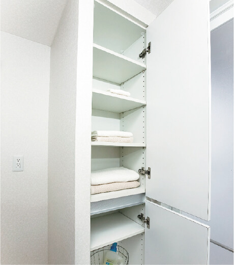 バスタオルや洗剤のストックなどがスマートに収納できるスペースを洗面室内に確保しました。(Dタイプ)