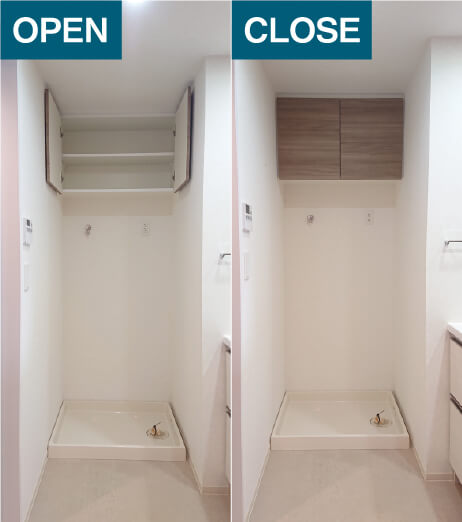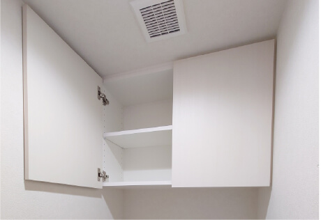 洗濯機上部のスペースを有効活用した壁面収納。普段使う生活用品の出し入れがしやすく、機能的にお使いいただけます。