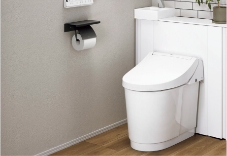 タンクや給水管などがすっきりと納まり、必要なものを整理することもできるキャビネット付トイレ。タンクレスのようなスマートな見た目で、お掃除もラクに行えます。