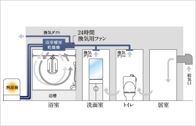 ※掲載の室内写真は、「すまいのカフェテラス」コンセプトルームを撮影(2021年4月)または弊社モデルルームを撮影(2019年4月)したもので一部オプションを含み実際とは異なります。掲載の参考写真は弊社施工例及びメーカー写真のため、実際と異なる場合があります。※掲載の概念図は図式化したもので実際とは異なります。※掲載の図面は設計段階のもので、施工上の都合などにより変更される場合があります。※1マンションは気密性が高く、24時間換気を使用した状態で給気口(差圧式含む)を閉じると室内が負圧となり、扉や窓が重くなる等の事象が生じます。また、外から空気が入ろうとするため、サッシの音鳴りやレンジフードからの外気の逆流、部材の破損等を生じさせる恐れがあります(使用条件により異なります)。