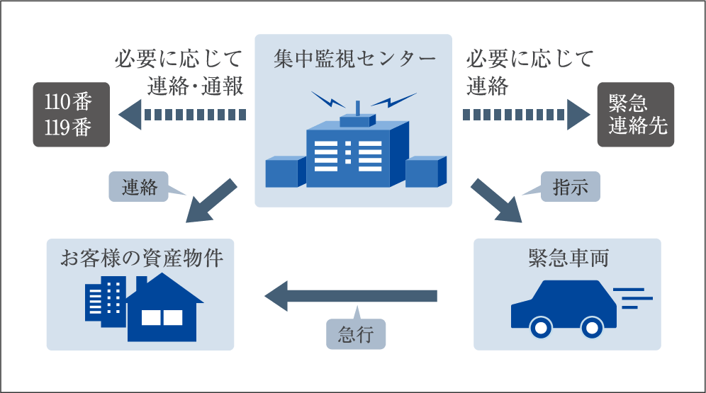 各戸の防犯・緊急押しボタン・火災・ガス漏れの各信号を即座に24時間監視センターにてキャッチ。併せて共用部の火災・共用設備の異常信号もキャッチし、暮らしの安全を見守ります。なお、異常が認められた際には緊急対処員が急行します。