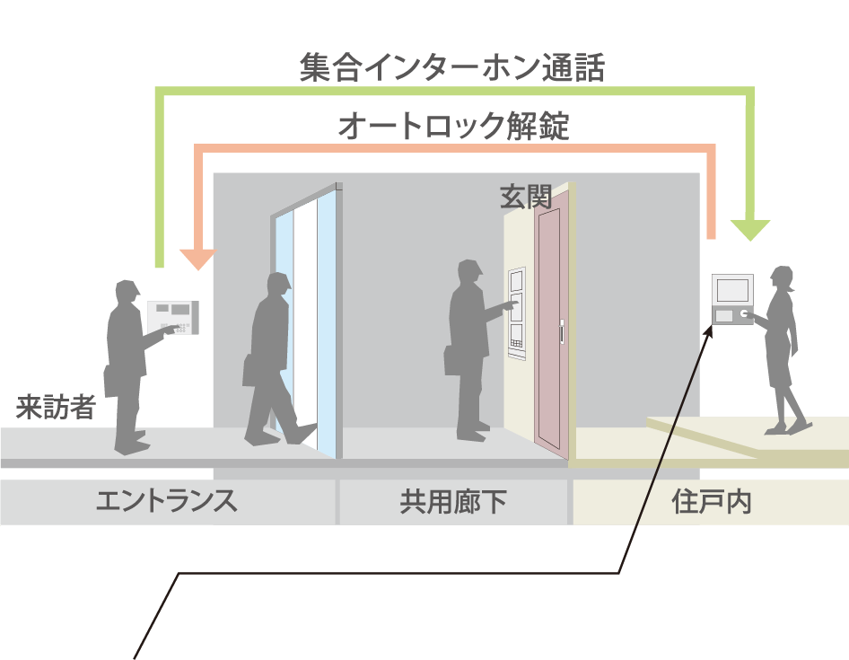エントランスの来訪者を住戸内からモニターで確認後、ドアを解錠。さらに玄関前でも音声で再確認できる二重チェックシステムです。