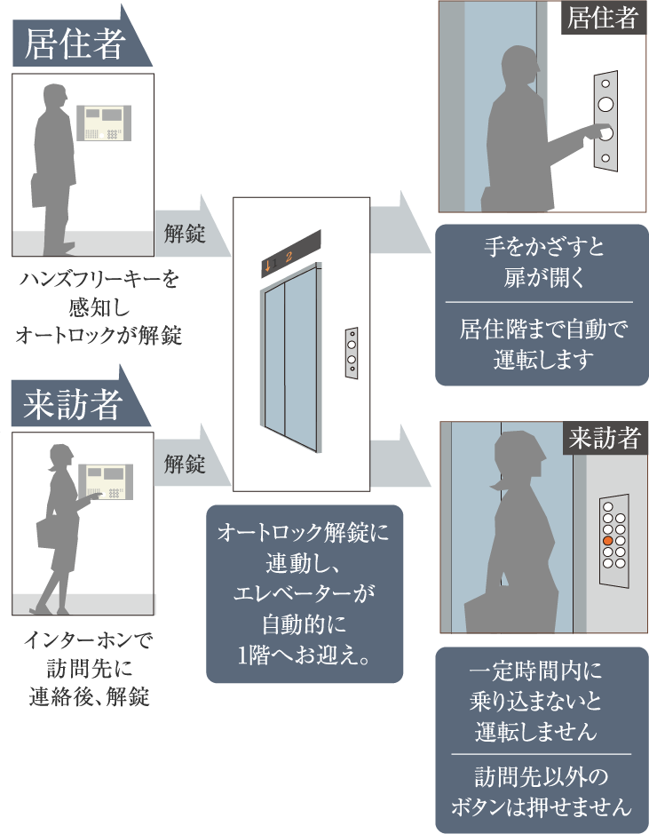 エントランスの認証入館システムとエレベーターセキュリティシステムの連動で、目的階以外への出入りを制御します。また不審者の侵入を防ぐ機能としても威力を発揮します。