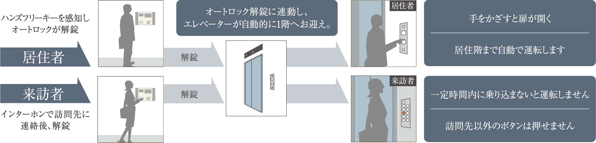 共用部リーダーを通過後、EV前のセンサーに手をかざすと、感知して扉が開きます。EVに乗ると居住階のみ降車が可能となります。