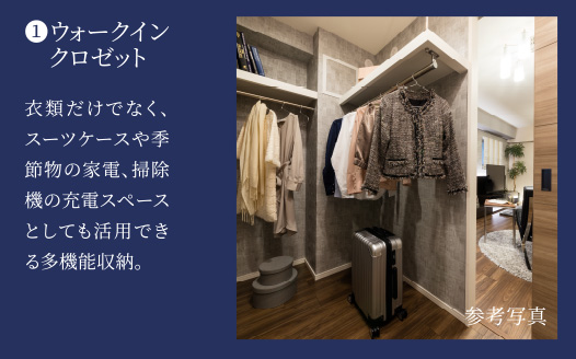 衣類だけでなく、スーツケースや季節物の家電、掃除機の充電スペースとしても活用できる多機能収納。