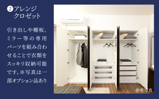 引き出しや棚板、ミラー等の専用パーツを組み合わせることで衣類をスッキリ収納可能です。※写真は一部オプション品あり