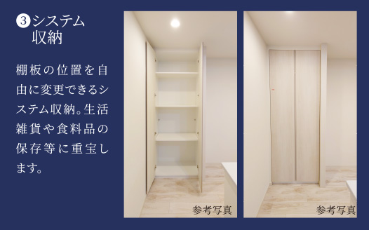 棚板の位置を自由に変更できるシステム収納。生活雑貨や食料品の保存等に重宝します。