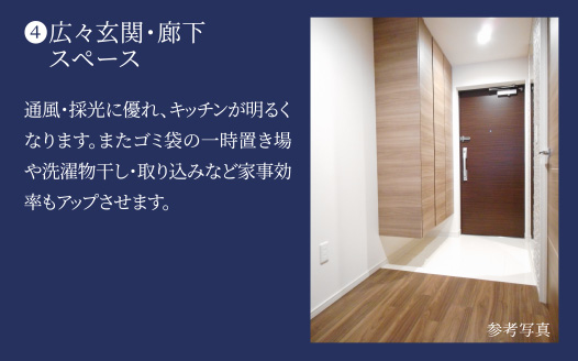 洋室(1)に引戸を採用すると同時に1.2m超の廊下幅を実現、玄関・廊下スペースにゆとりをもたらします。