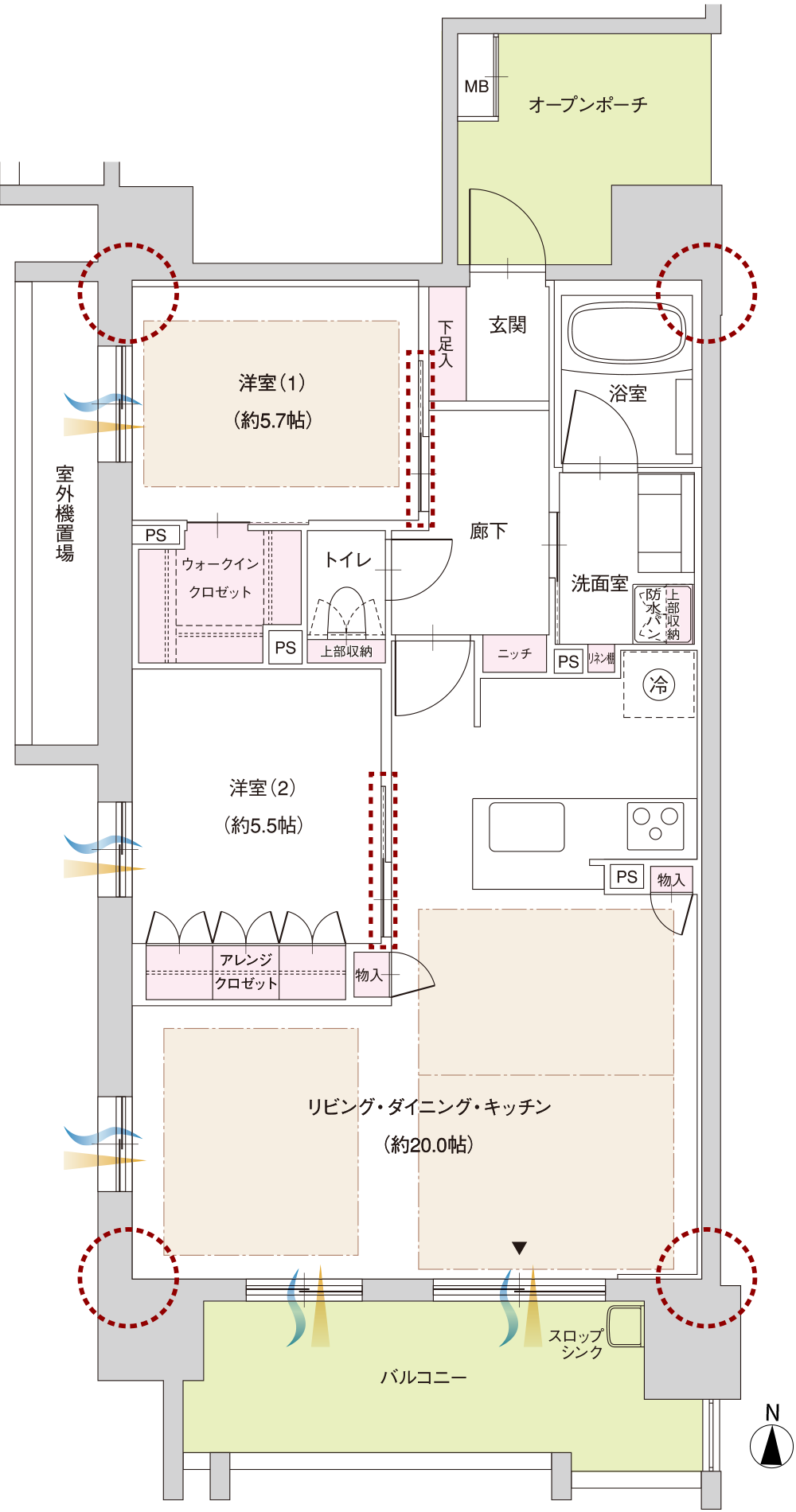 2種のクロゼットを使い分ける角住戸2LDK(オープンポーチ付)プラン。