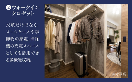 衣類だけでなく、スーツケースや季節物の家電、掃除機の充電スペースとしても活用できる多機能収納。