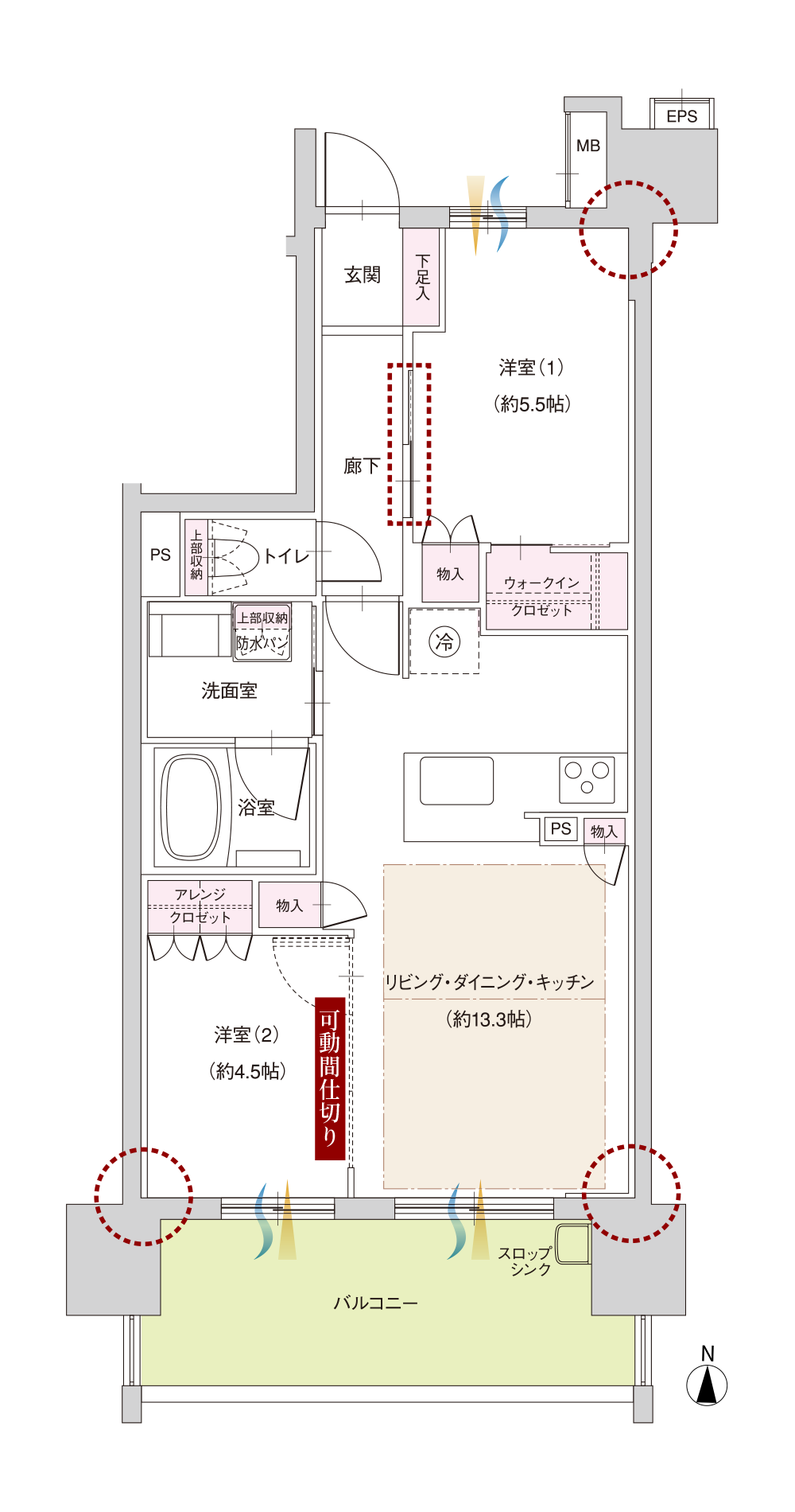 2LDK↔︎3LDKを自在に転換可能な可動間仕切りを採用。