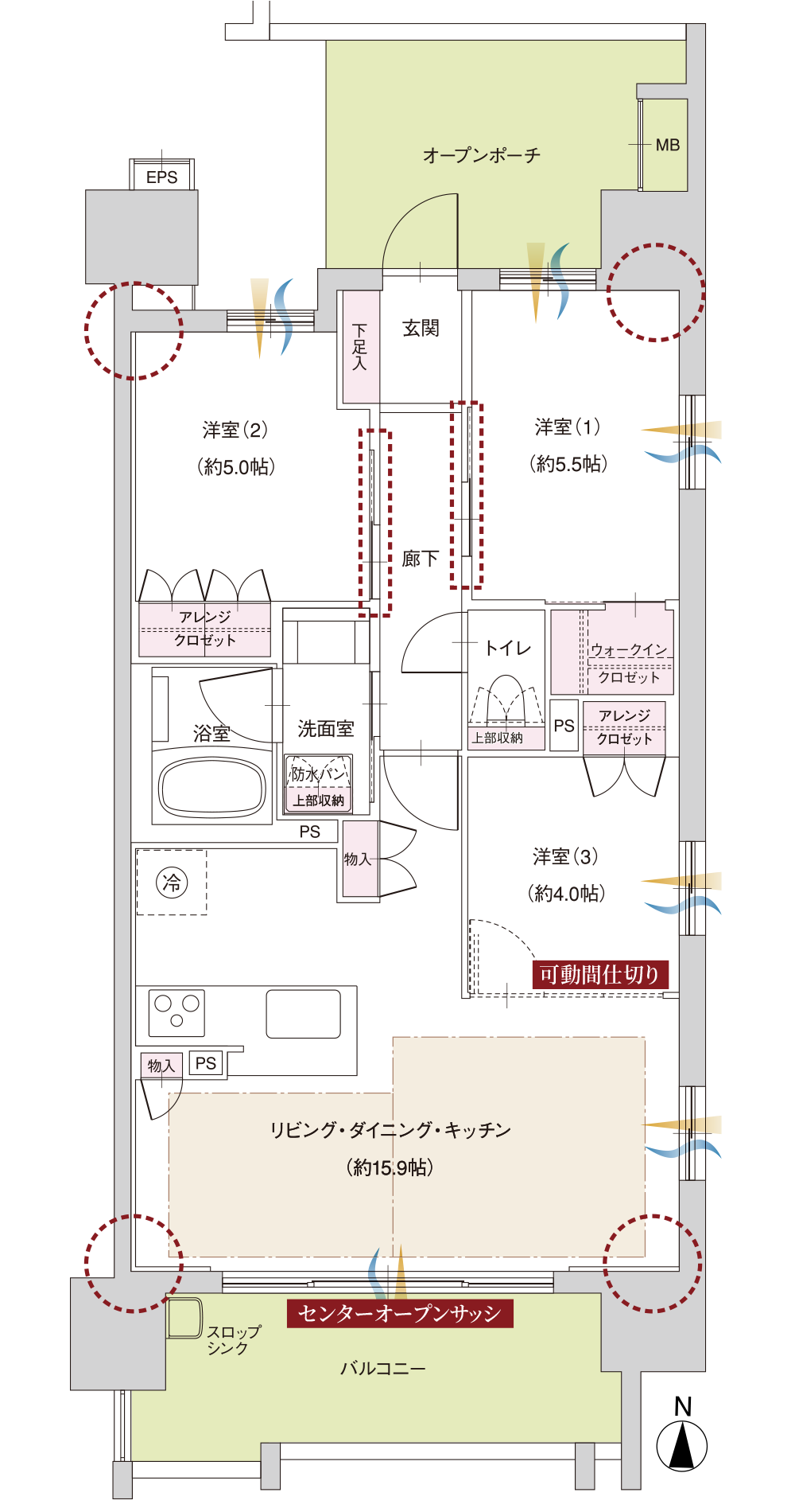 2LDK↔︎3LDKを自在に転換可能な可動間仕切りを採用。