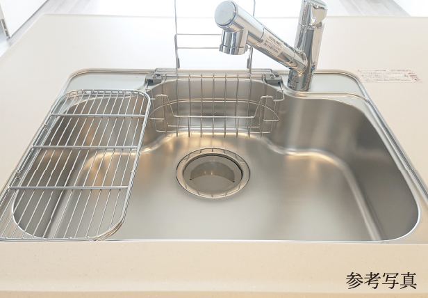 大きなフライパンも洗いやすい大型サイズ。シンク裏の制振材が水はね音を抑えます。