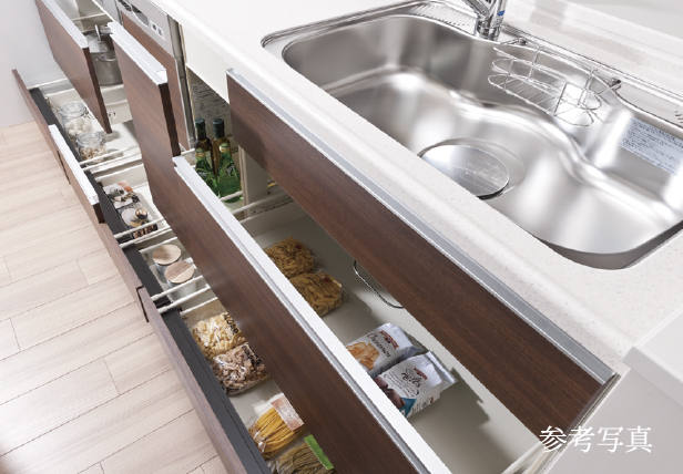 収納物が一目で見渡せ、出し入れも便利なスライド収納。扉がゆっくりと閉じるソフトクローズ機能付です。