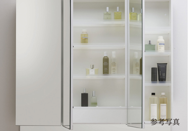 鏡裏に収納スペースを設けた大型三面鏡を採用。洗面用具や化粧品、小物が収納でき便利です。