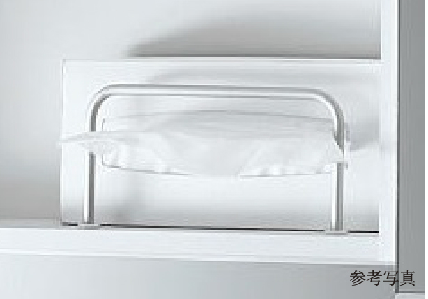 三面鏡裏の収納には、ティッシュBOXを置くのに便利なホルダーも備えました。