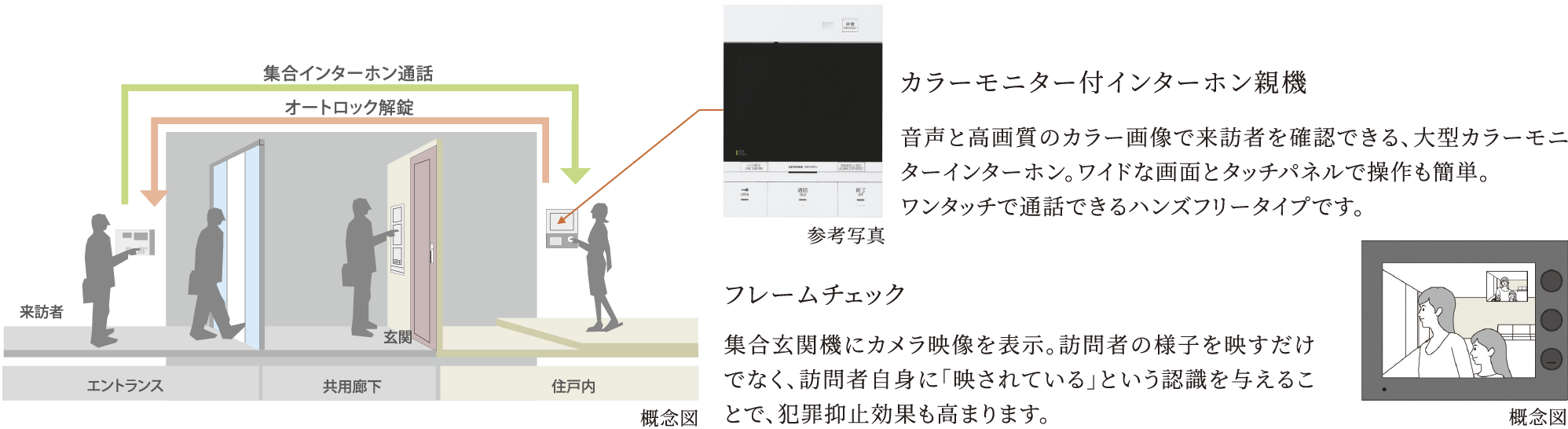 エントランスの集合玄関機前を通行することで、エントランスのオートロックが解錠できるハンズフリーキーを採用しました。また、来客の際は、住戸内のモニターでエントランスの来訪者の顔と声を確認できます。