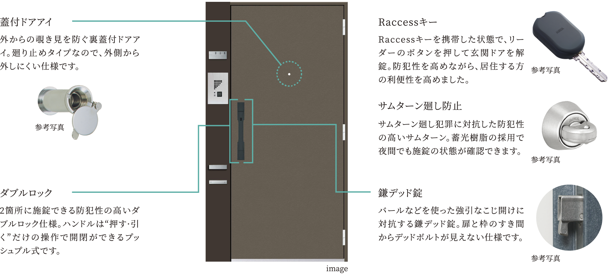共用廊下に面するすべての窓には、暮らしのプライバシーを守るブラインド面格子を装備。ルーバーの角度が自在に調節できるので、外部からの視線を遮りながら通風·採光を確保することができます。また、窓からの住戸侵入を防ぐのにも役立ち、防犯面でも効果的です。